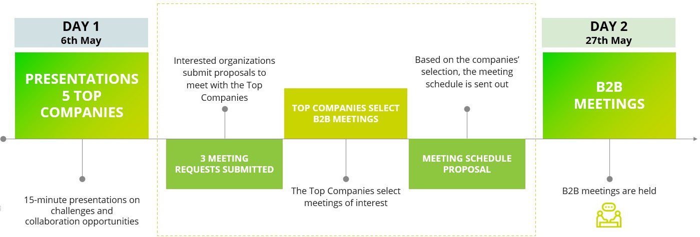 Selected companies will join a 20-minute bilateral meeting with the Top Company, designed to turn strategic challenges into concrete business opportunities.